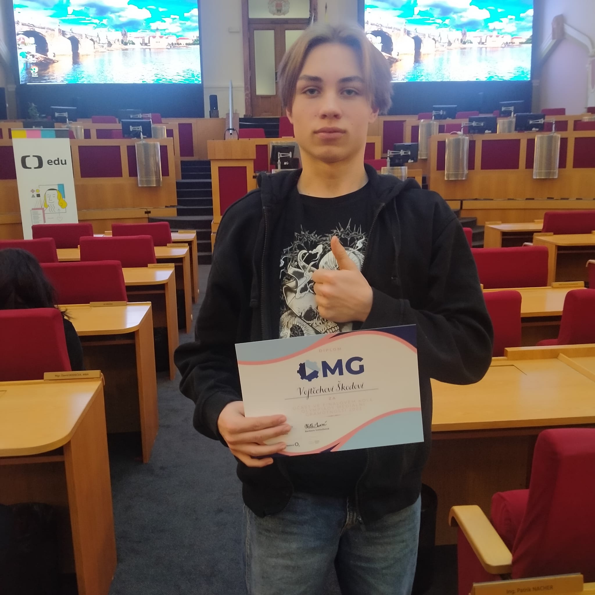 1. prosince absolvoval na Magistrátu hlavního města Prahy s dalšími 50 účastníky písemný test, kde skončil na 17. místě. Do finále sice nepostoupil, ale za vzornou reprezentaci školy patří Vojtovi velké poděkování.